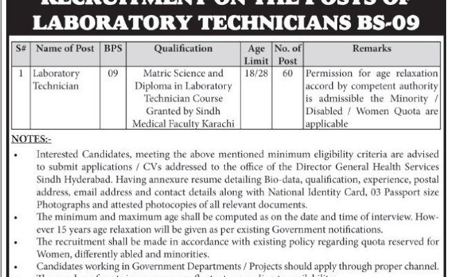 Lab Technician Jobs In Health Department Sindh 2021 Hyderabad Directorate General Health Services Latest In Hyderabad Sindh Express On 07 Jan 2021 Jobs In Pakistan